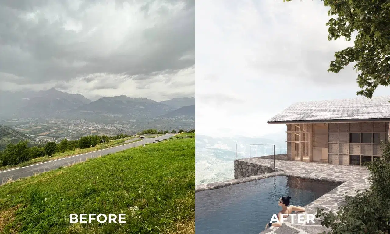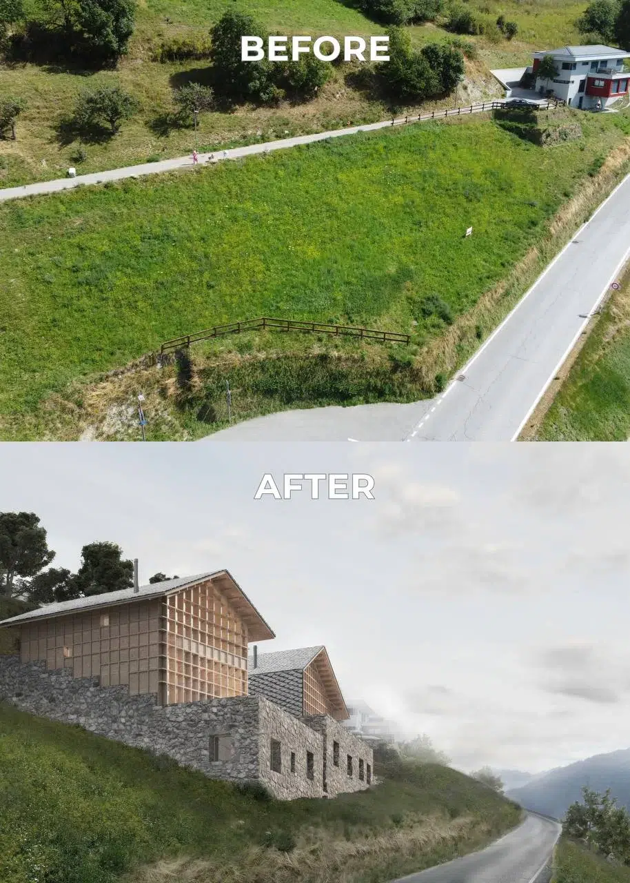 Le site est situé dans le petit village suisse de Veysonnaz, sur la rive droite du Rhône, offrant une vue imprenable sur la vallée du fleuve et les Alpes bernoises. Le principal défi de ce terrain est son emplacement sur un versant ouest escarpé ; nous avons donc dû trouver une solution qui offrirait aux résidents des bâtiments une vue magnifique le soir, tout en garantissant que les locaux ne soient pas surchauffés par le soleil intense de l'après-midi.