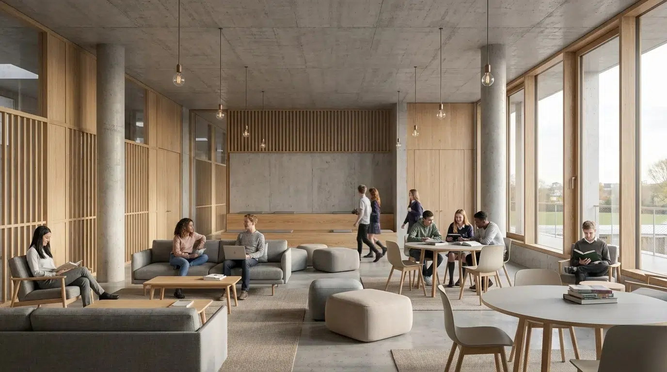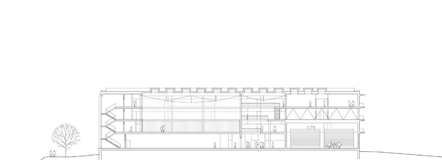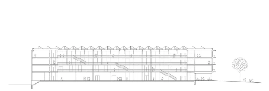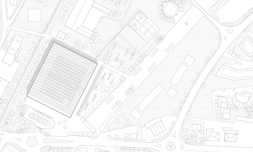 Avant de commencer la planification, nous avons soigneusement analysé les itinéraires piétonniers existants et les connexions potentielles qui pourraient contribuer au canal allant à l'ouest du site. Cela nous a permis de trouver l’endroit le plus approprié pour le bâtiment. Afin de maintenir une échelle co-localisée, nous avons placé l'école à quatre étages. Un axe central relie l'entrée, la pièce principale et le gymnase. Les fenêtres zénithales s’ouvrant au nord fournissent une lumière diffusant aux zones de circulation du gymnase. Les parois transparentes du gymnase, qui dispose d'une entrée indépendante, apportent de la lumière dans les couloirs. Au premier étage, il y a l'administration et les salles qui sont disponibles pour la location. Les salles d'études sont situées autour du périmètre à trois étages. Les façades est et sud sont assemblées à partir d'éléments préfabriqués. La forme en U donne l’accès à un balcon depuis les salles d'études et protège des rayons directs du soleil. La fréquence des éléments verticaux de la façade ouest fonctionne sur un principe identique : cela protège les salles d'études des rayons directs du soleil à la fin de journée. Cette méthode a également été appliquée à la façade nord. L'entrée principale est accentuée par des éléments en bois sous forme de colonnes et de bancs pour les écoliers. La zone des loisirs est située à l'est. Les terrains de sport sont décalés au nord, et l'espace pour une éventuelle extension est réservé au sud de ceux-ci.