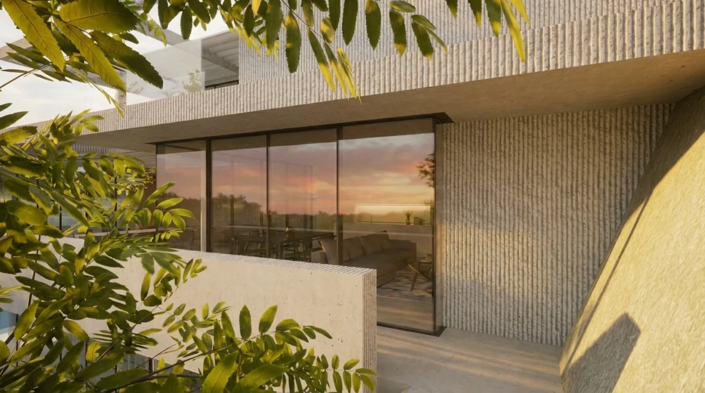 Les structures de la façade de la résidence sont principalement composées de vitrages allant du sol au plafond et d'un deuxième matériau solide, le béton, qui se décline en deux variantes : une surface lisse ou rayée. Cette alternance de verre transparent et de béton permet à la fois de créer un lien avec le paysage environnant et de préserver l'intimité des terrasses de la résidence.