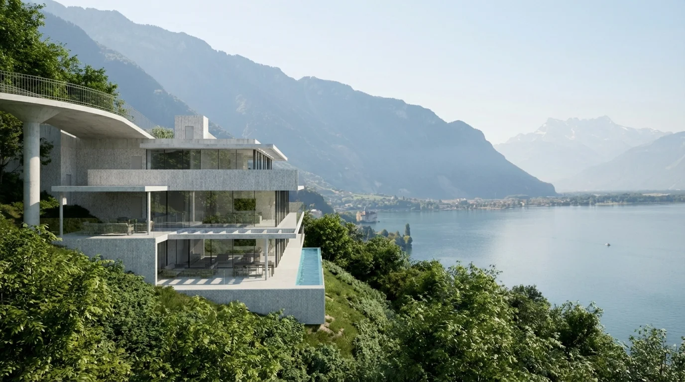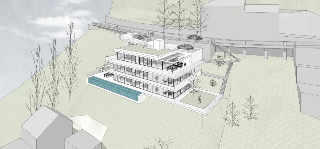 Ce projet est situé sur une magnifique pente escarpée des rives du lac Léman, avec une vue imprenable sur la montagne Le Grammont. Un architecte local nous a contactés afin de créer un design qui serait apprécié par la communauté locale, car il s'agira du dernier nouveau bâtiment autorisé dans la région.