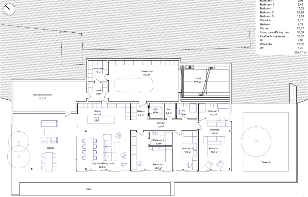 La résidence comprend trois appartements isolés, situés les uns au-dessus des autres. La superficie des appartements varie de 110 m² à 210 m², augmentant du dernier étage au rez-de-chaussée. Un monte-charge est prévu pour le stockage des voitures et permet d'accéder aux trois niveaux. La résidence présente un contour simple et une disposition logique à tous les étages, ainsi qu'une façade laconique. Cette conception s'inscrit dans la lignée du rationalisme suisse, tout en évitant l'impression d'un immeuble d'appartements à la disposition typique.