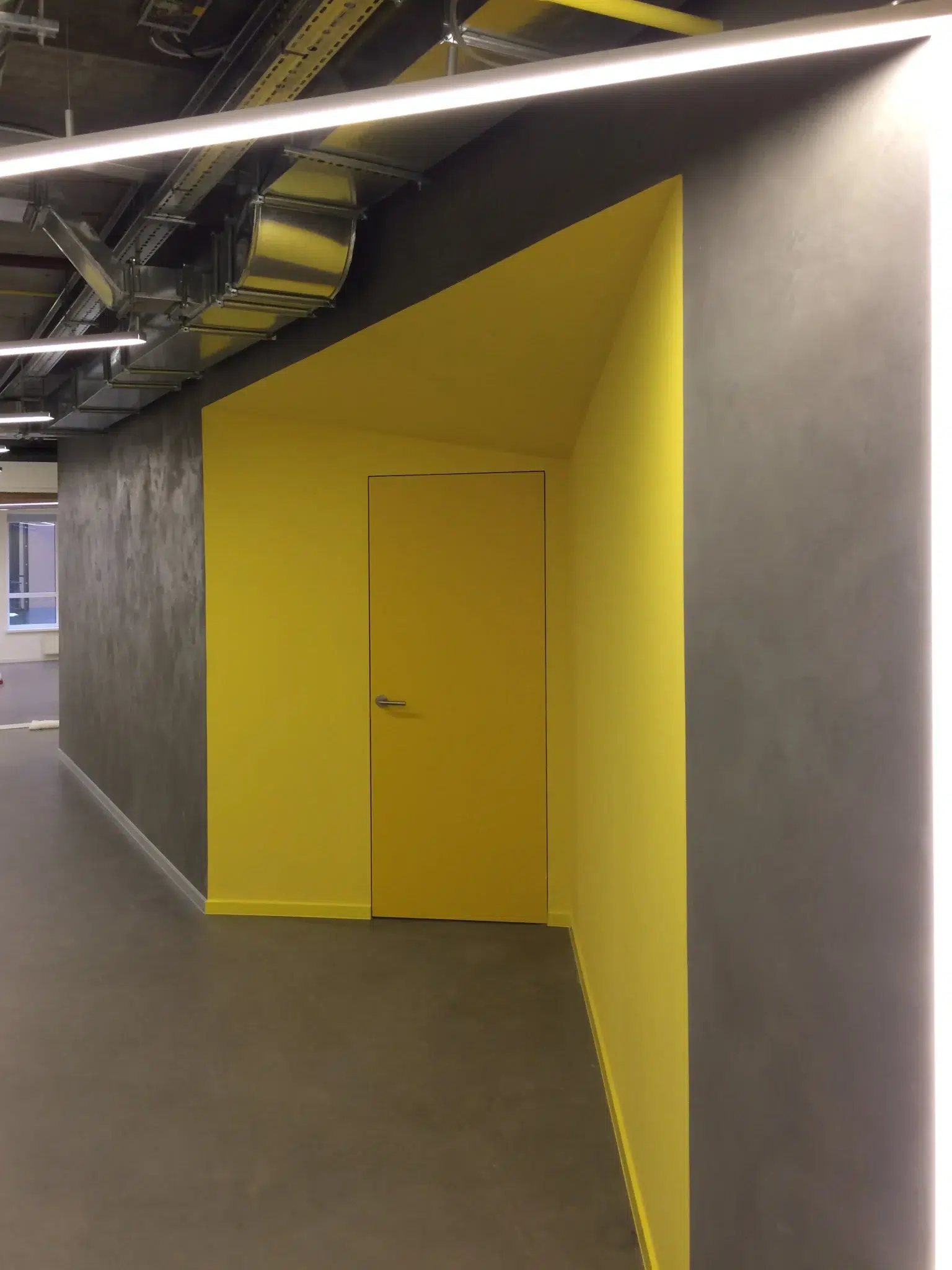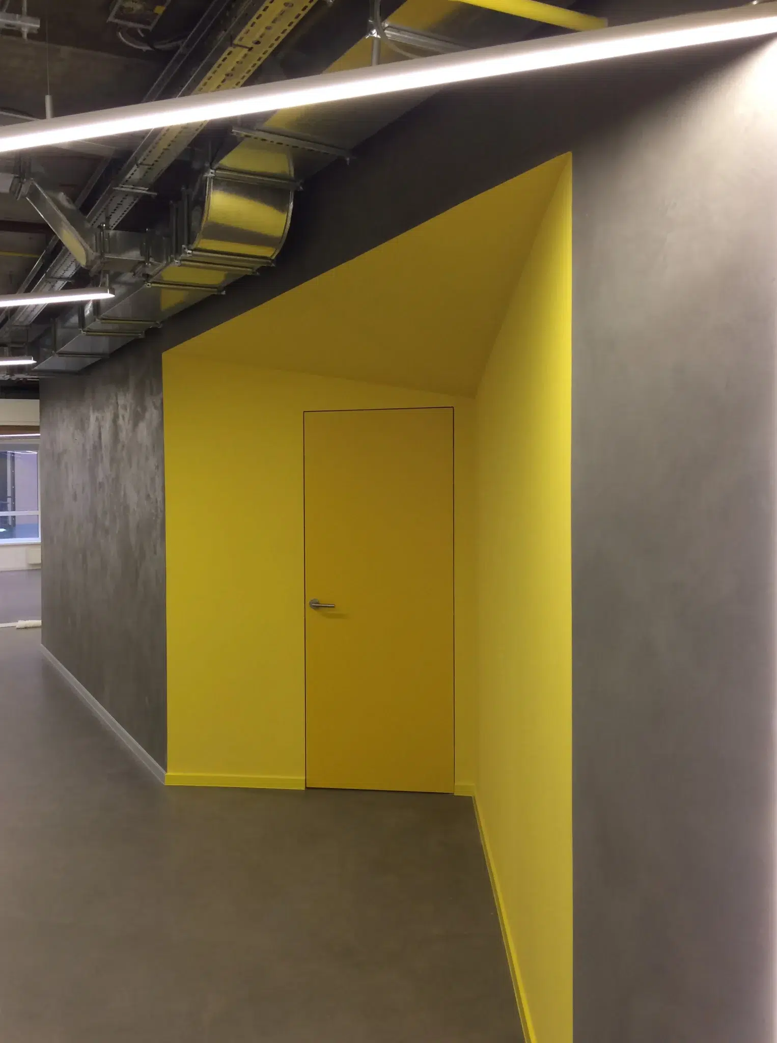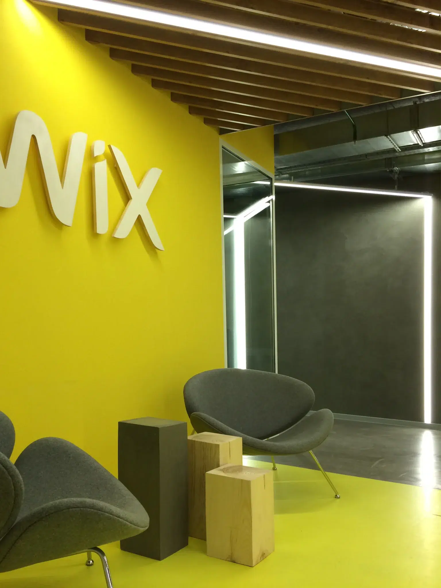Le bureau Wix est devenu un bâtiment emblématique. Tous les travaux de conception ont été réalisés en un mois. Le design intérieur n'a pas été affecté, mais a acquis les caractéristiques distinctives du style de l'entreprise. La couleur jaune vif fait ressortir les zones sur le fond de béton gris. Dans l'ensemble, le bureau est fonctionnel et simple, avec un espace aussi efficace que possible. Réception, archives, bureaux, salle de réunion. Les zones et les pièces sont partiellement recouvertes de contreplaqué et de métal, mais la plupart sont restées inchangées, avec des communications ouvertes, des murs et des plafonds non recouverts.