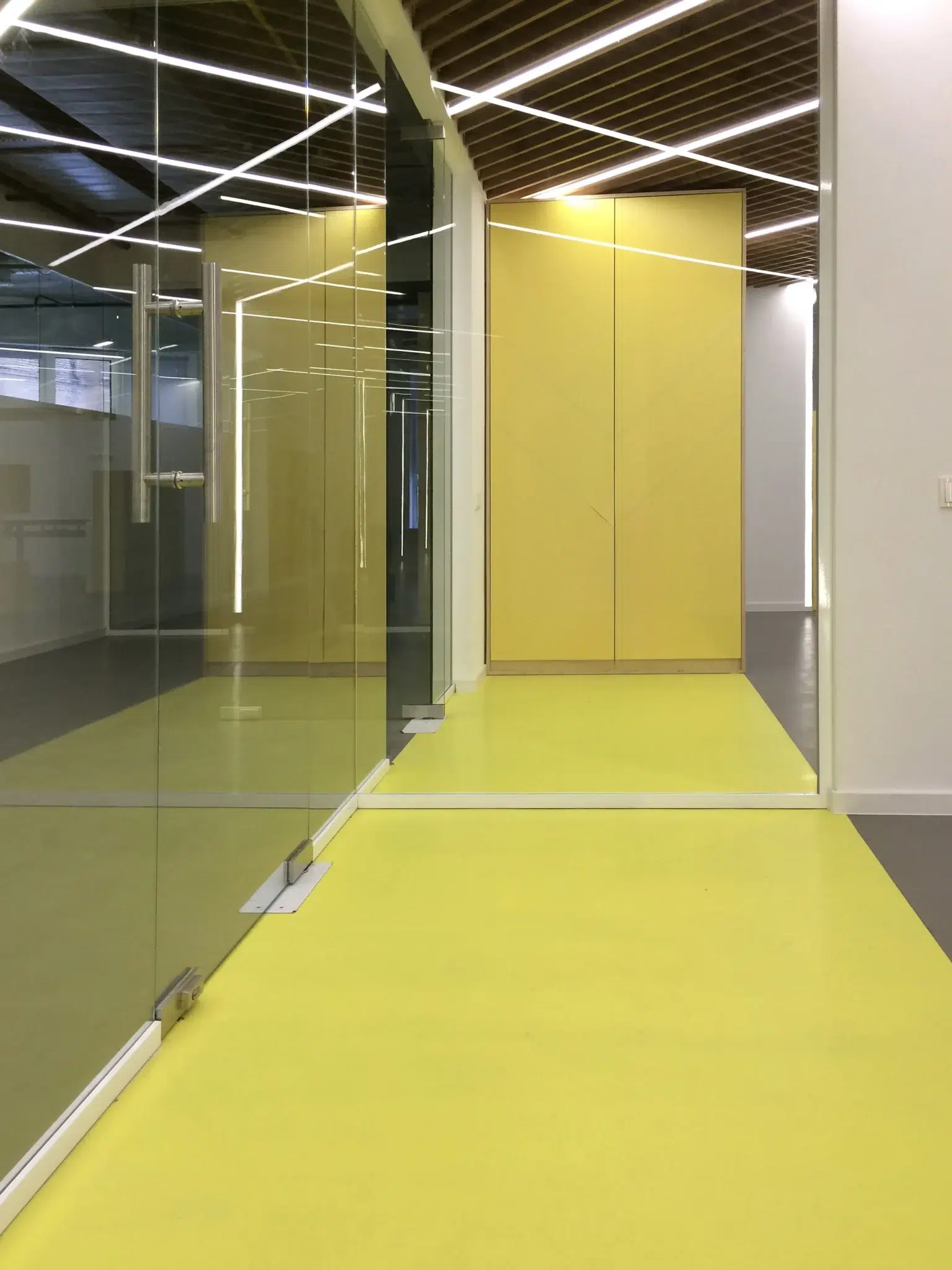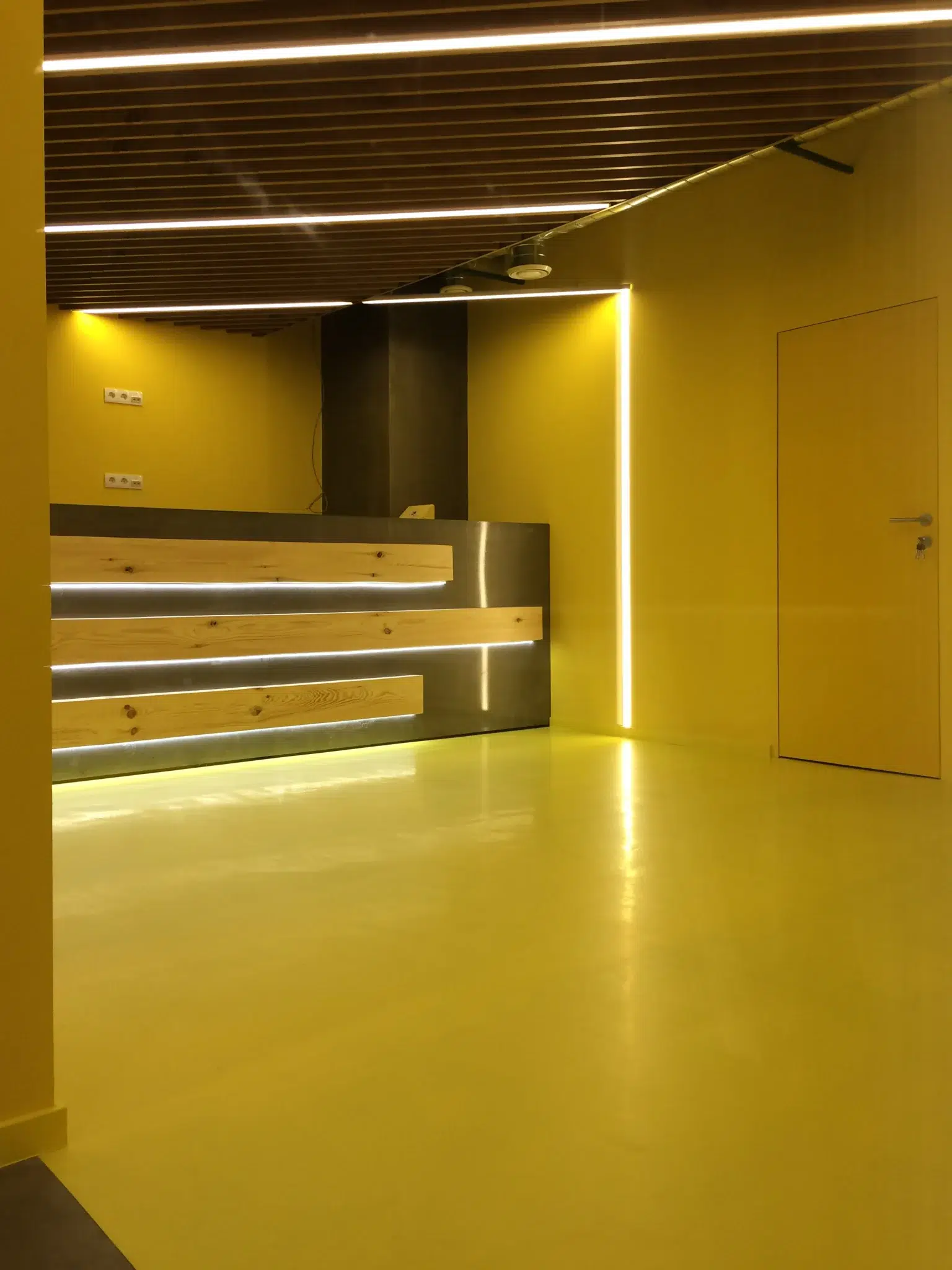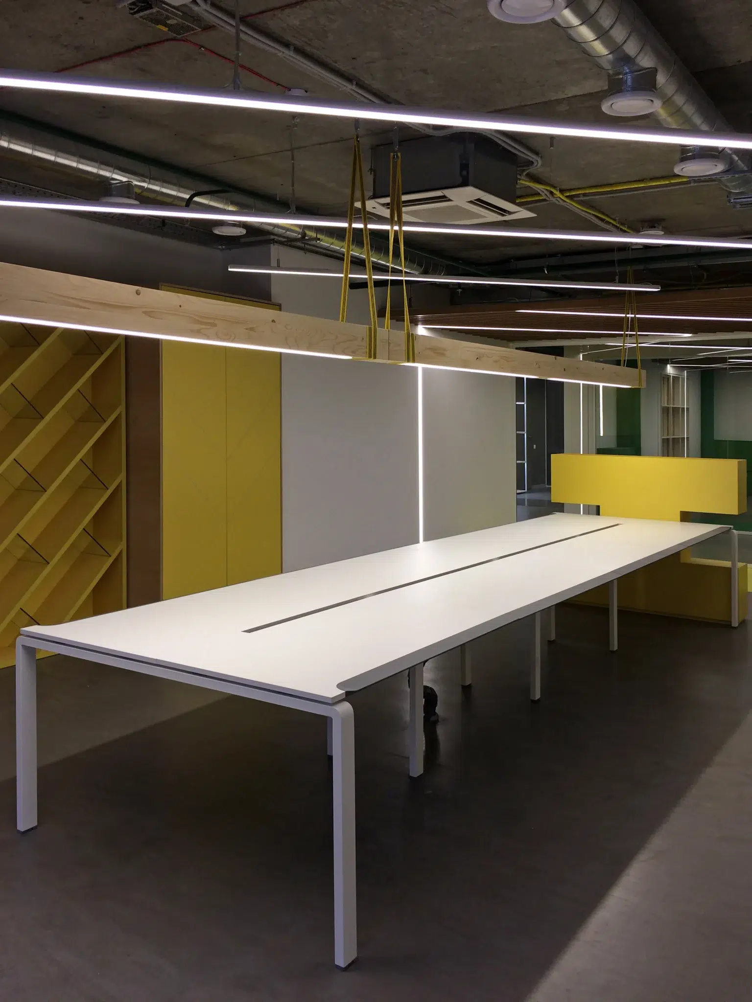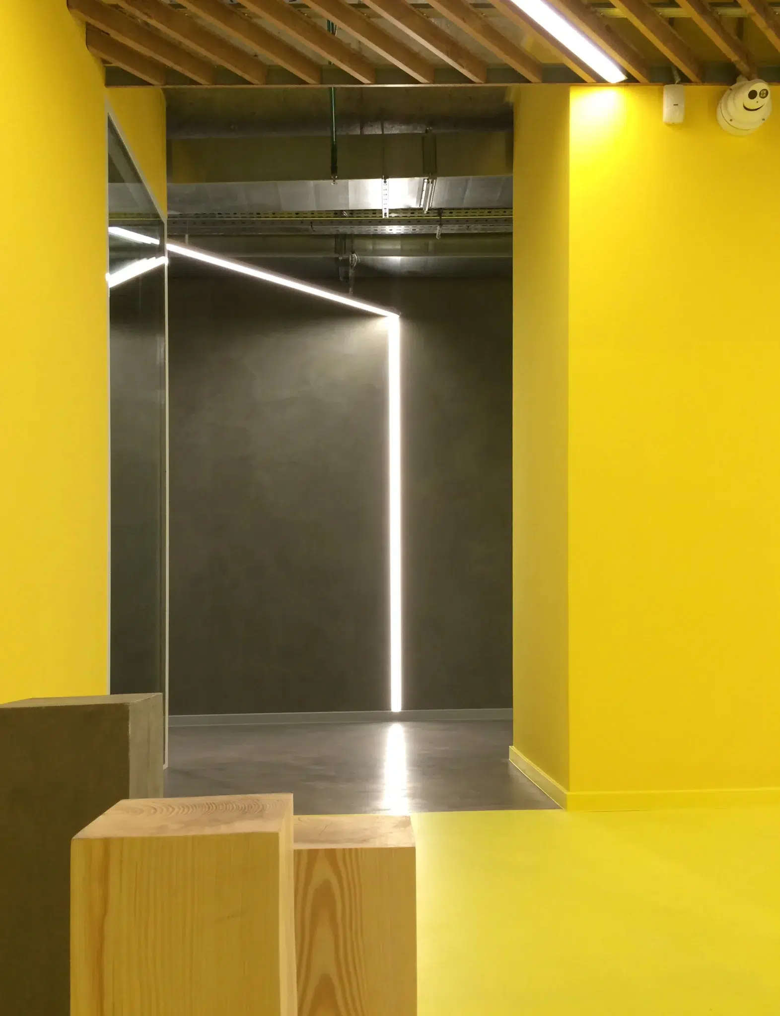 Le bureau Wix est devenu un bâtiment emblématique. Tous les travaux de conception ont été réalisés en un mois. Le design intérieur n'a pas été affecté, mais a acquis les caractéristiques distinctives du style de l'entreprise. La couleur jaune vif fait ressortir les zones sur le fond de béton gris. Dans l'ensemble, le bureau est fonctionnel et simple, avec un espace aussi efficace que possible. Réception, archives, bureaux, salle de réunion. Les zones et les pièces sont partiellement recouvertes de contreplaqué et de métal, mais la plupart sont restées inchangées, avec des communications ouvertes, des murs et des plafonds non recouverts.