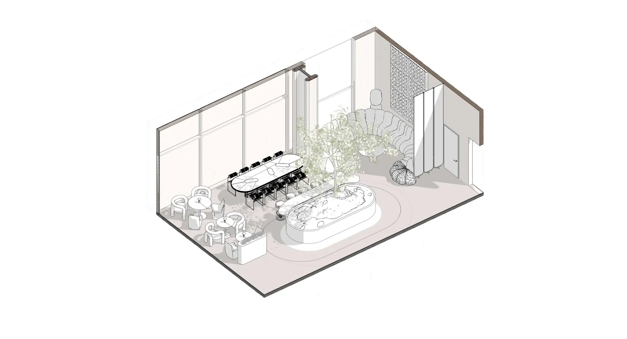 Les formes organiques sont sculptées avec précision, tandis que l'éclairage expressif définit le rythme spatial. Les lignes fluides, les couleurs immersives et les éléments sculpturaux créent une sensation de mouvement et de profondeur, transformant le hall en une déclaration d'identité, d'atmosphère et de vision.