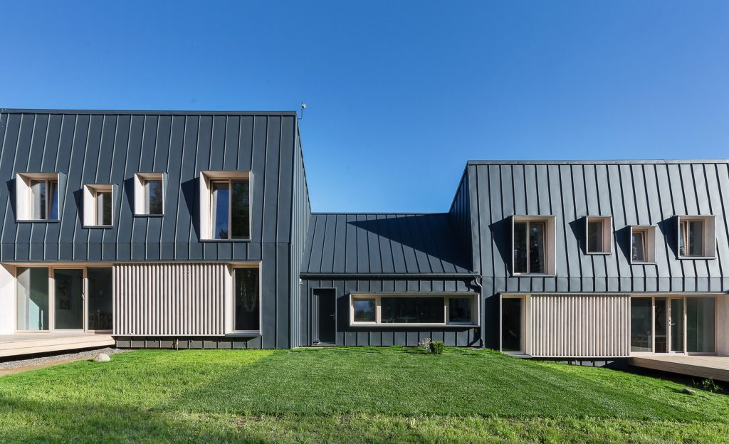 This project combines two residential buildings and a studio-workshop in a single volume. This combination of different functional elements under a single roof is characteristic of Karelian residential architecture. The common room occupies half of the first floor and extends from the closed south façade to the north façade, which offers a panoramic view of the forest. The space is cut in half by southern light that fills the house through a long window in the side wall and on the roof. The terrace is an organic extension of the dining room. Like a pier, it floats above the ironing of the grass.