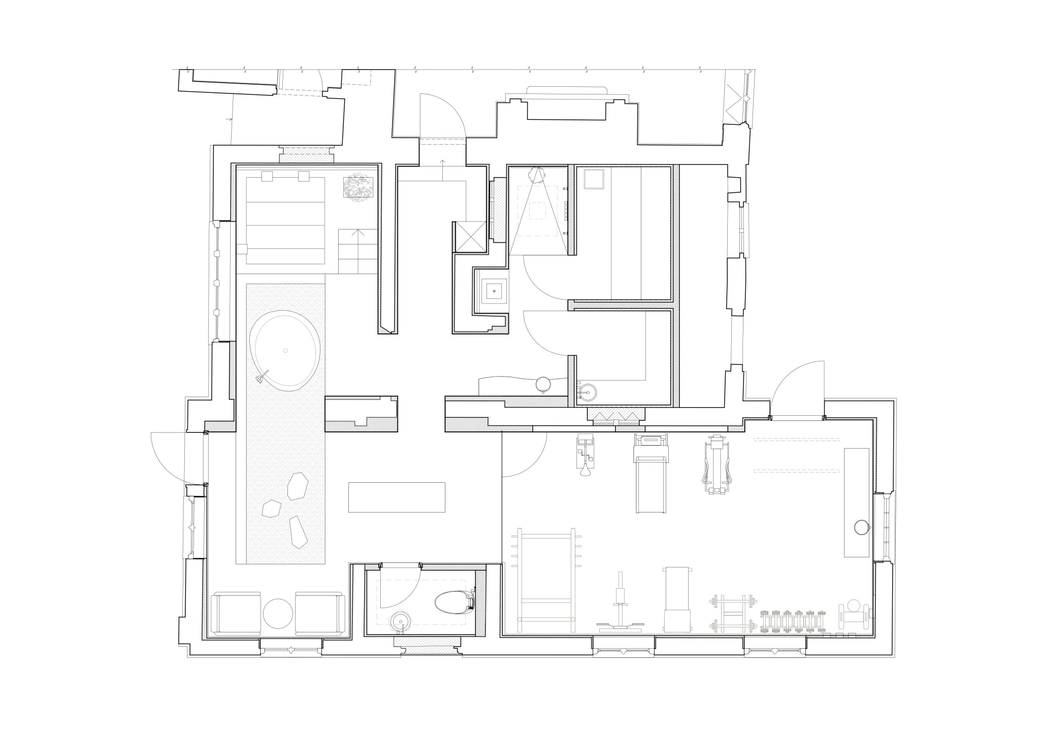 The primary objective was to expand and merge several different zones, just as water in a river does when it flows through different landscapes. So the spa zone flows into the zen garden, the zen garden into the gym.